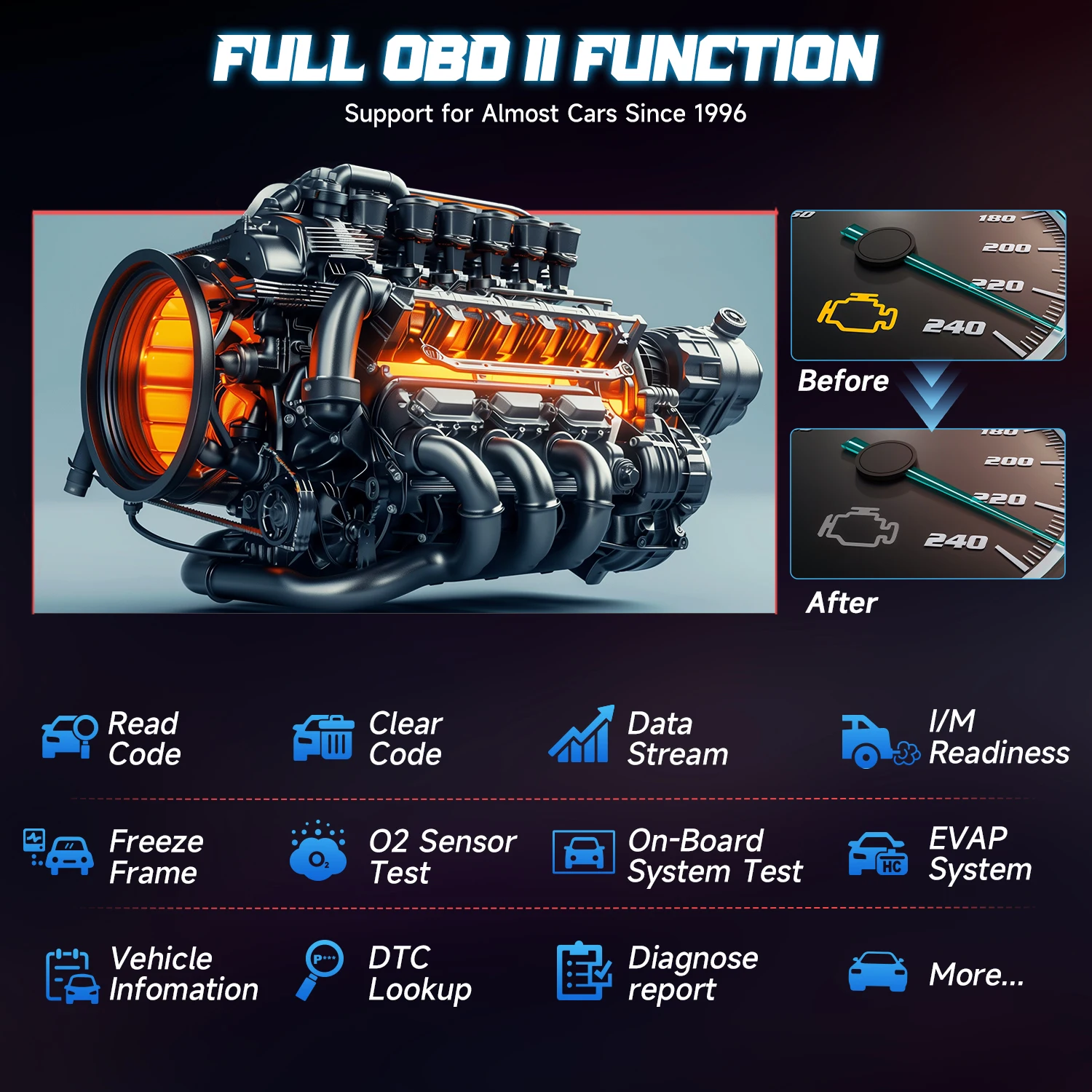 The diagnostic tool can help detect the engine ignition, fuel injection, air and fuel ratio, and exhaust emission conditions in Engine system to enhance vehicle performance, save energy and reduce exhaust emission.