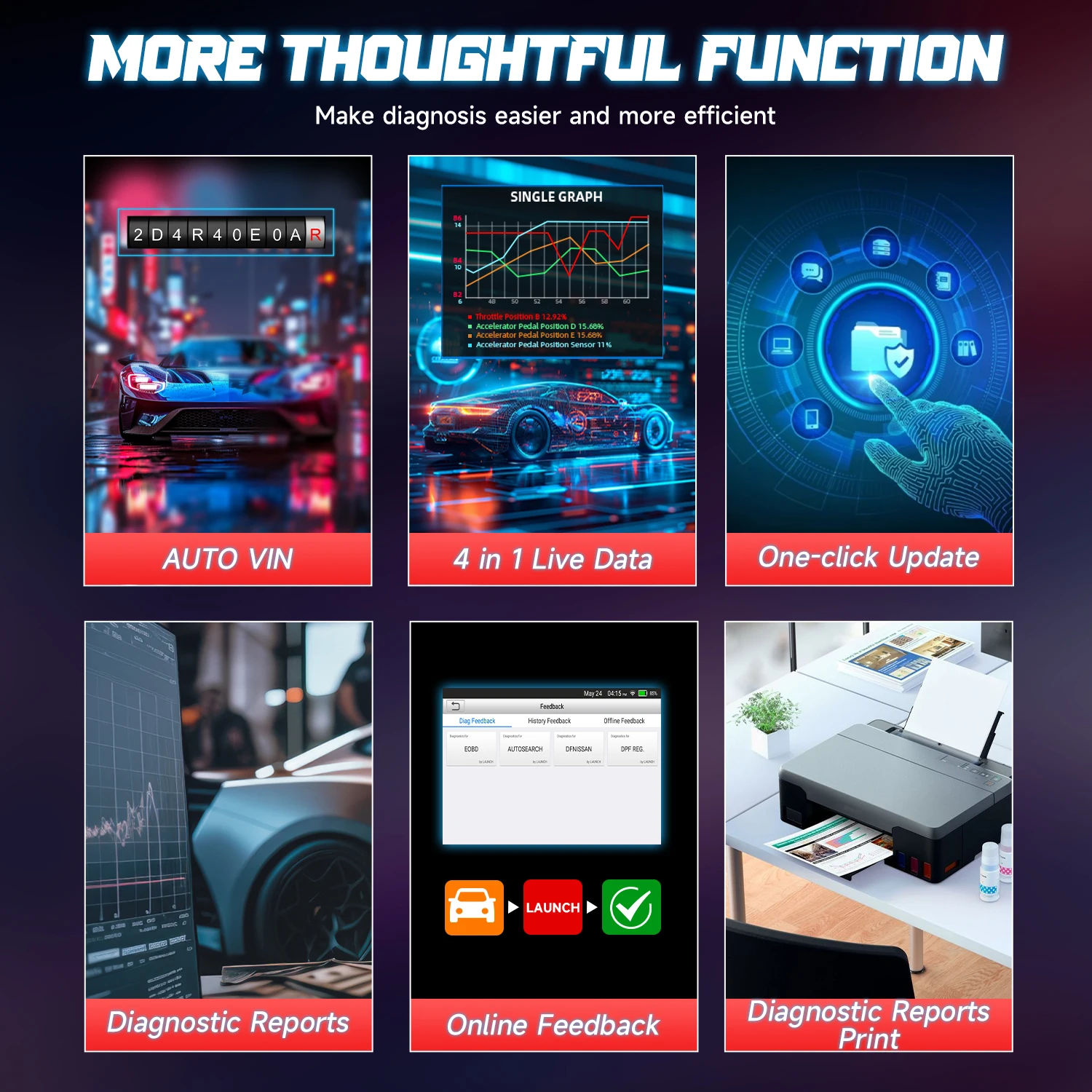 ✔Email Health Report Share & Print: LAUNCH Scan tool enables diagnostic technicians to generate diagnostic reports before and after car diagnosis and repair service, so that the diagnostic reports can be printed out or sent to customers through the Internet (email) and compared or shared with customers.